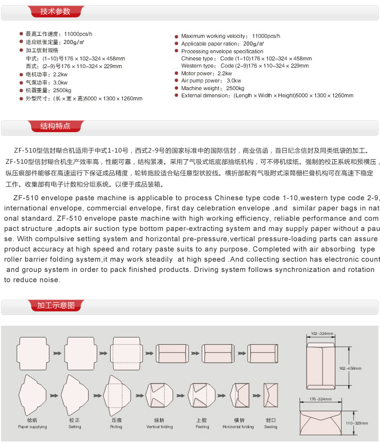 - ZF-390A全自動(dòng)中西式信封機(jī)適用于中式1-7號(hào),西式1-7號(hào)的國(guó)家標(biāo)準(zhǔn)信封,商業(yè)信函,首日紀(jì)念信封及同類紙袋的加工。它采用了氣吸式堆底部抽紙結(jié)構(gòu),可不停續(xù)紙。